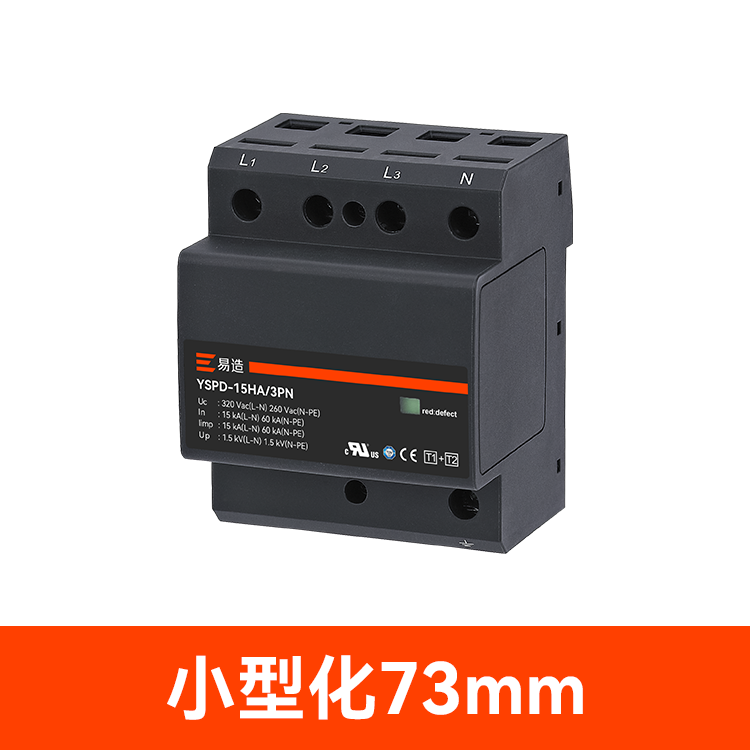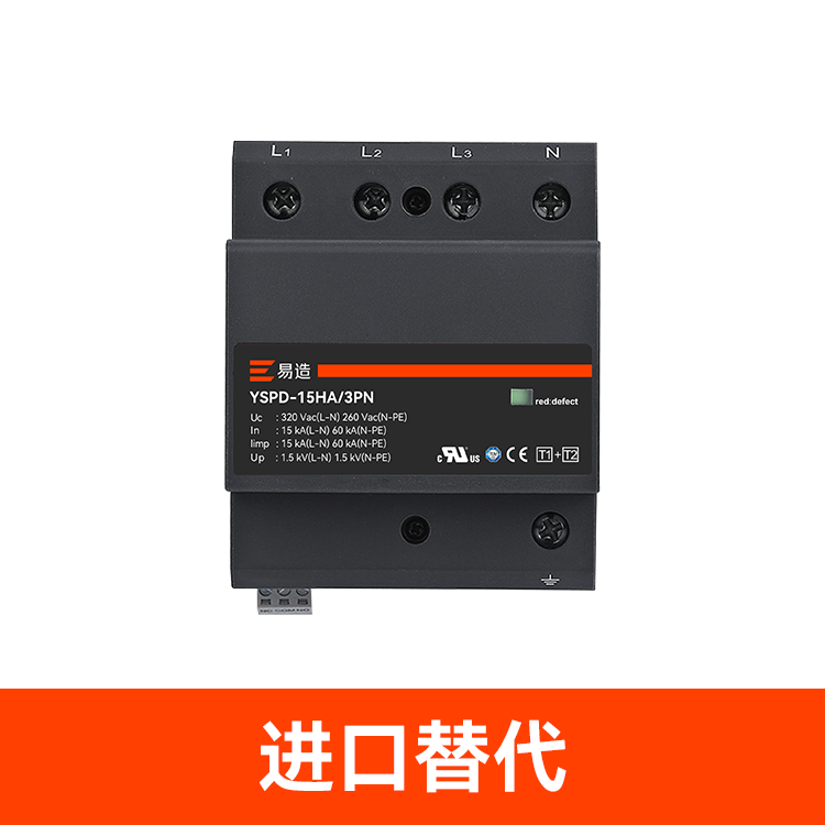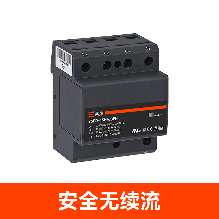 易造1+2級25kA復合型浪涌保護器安全無續流、小體積、高通流、低Up,帶故障指示遠程告警功能,維護方便,最大持續工作電壓Uc高達760Vac,可直接保護終端設備。