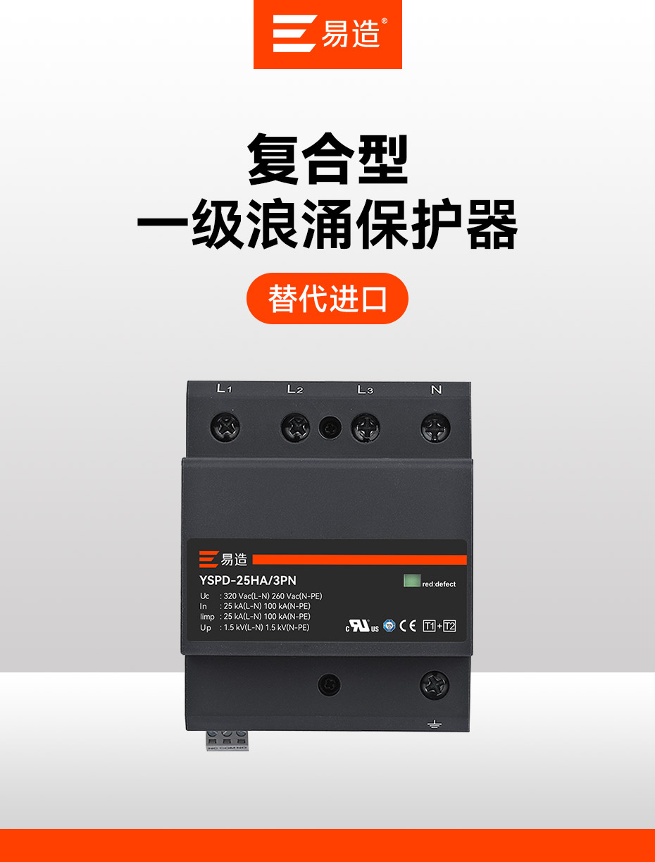 一級(jí)浪涌保護(hù)器通常安裝于獨(dú)立的總配電箱或主配電柜總進(jìn)線處,對(duì)電源傳輸線路遭受直接雷擊時(shí)的巨大能量進(jìn)行泄放,防止電氣設(shè)備過電壓損壞。易造YSPD系列T1類大通流SPD是能量協(xié)調(diào)的雷電流保護(hù)器,無需連接額外的線纜或安裝退耦器就能實(shí)現(xiàn)與二級(jí)浪涌保護(hù)器之間的能量協(xié)調(diào),簡(jiǎn)化了不同SPD級(jí)別間的安裝,使上下級(jí)SPD安裝更靈活。