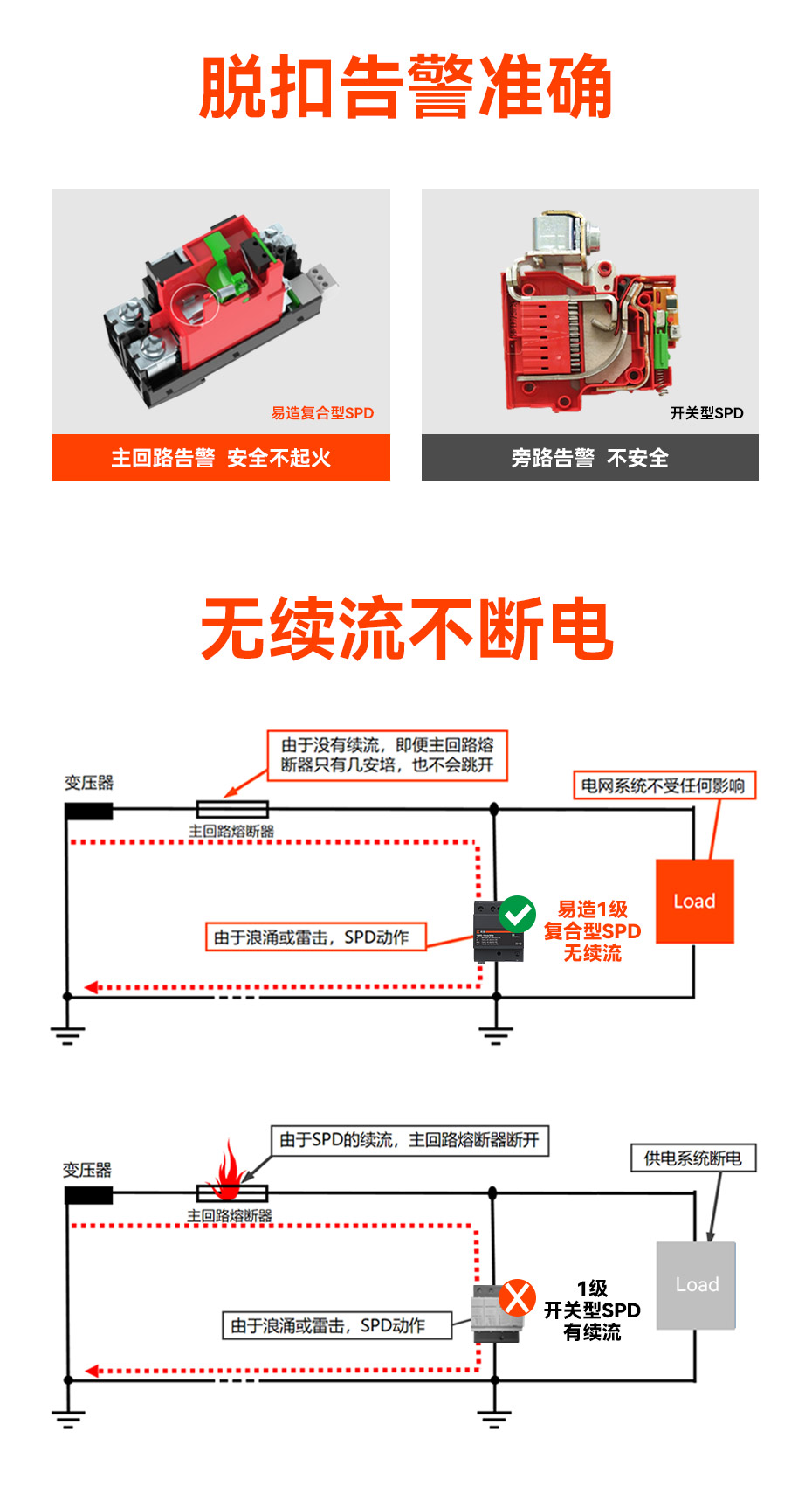 易造T1級(jí)浪涌保護(hù)器采用MG復(fù)合型技術(shù),無續(xù)流無漏電流,有效解決了傳統(tǒng)SPD易斷電易老化的短板缺陷,可長(zhǎng)期耐受諧波過電壓,使供電系統(tǒng)更加穩(wěn)定。小型化設(shè)計(jì)每相寬度僅一個(gè)模數(shù)(18mm)使配電箱空間更充裕。易造T1級(jí)SPD采用主回路脫扣裝置,當(dāng)SPD承受過電壓時(shí),即便是小電流也會(huì)導(dǎo)致脫扣裝置脫扣,主回路斷開無電流流過避免燃燒,從而避免誤告警。