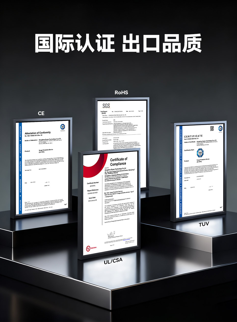易造T1級、T2級單相浪涌保護器,規格型號齊全,擁有UL、TUV、CE、CQC等國內國際質量認證,符合全球市場的最高安全和RoHS歐盟環保標準,可替代進口品牌SPD,支持出口。
