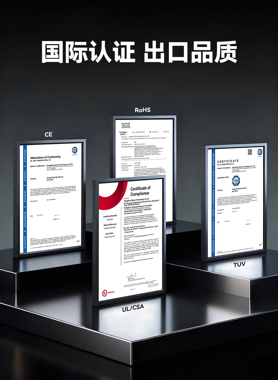 易造T2級大通流浪涌保護器,擁有UL、TUV、CE等國際質量認證,符合全球市場的最高安全和RoHS歐盟環保標準,可替代進口品牌SPD,支持出口。