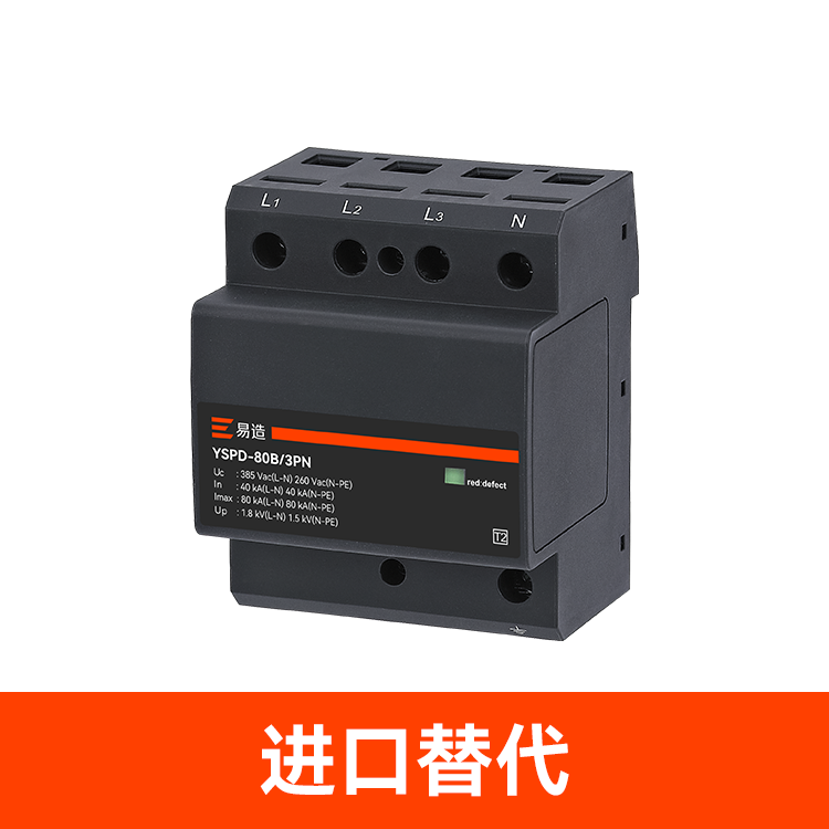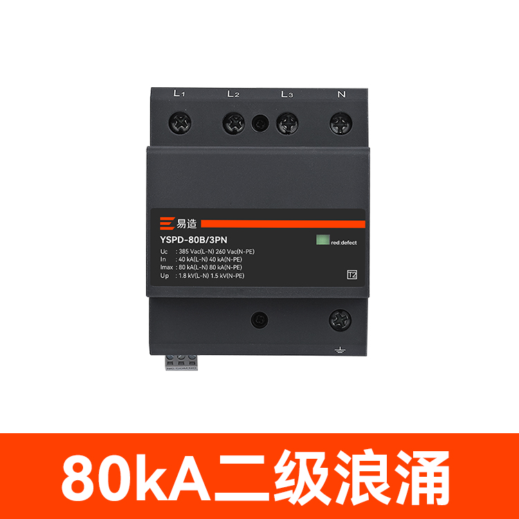 易造80kA二級浪涌保護器,小體積大通流,適用于各種供配電系統的單相和三相保護,帶本地和遠程告警功能,安裝簡單、維護方便,可用于3000米以上的高海拔地區。