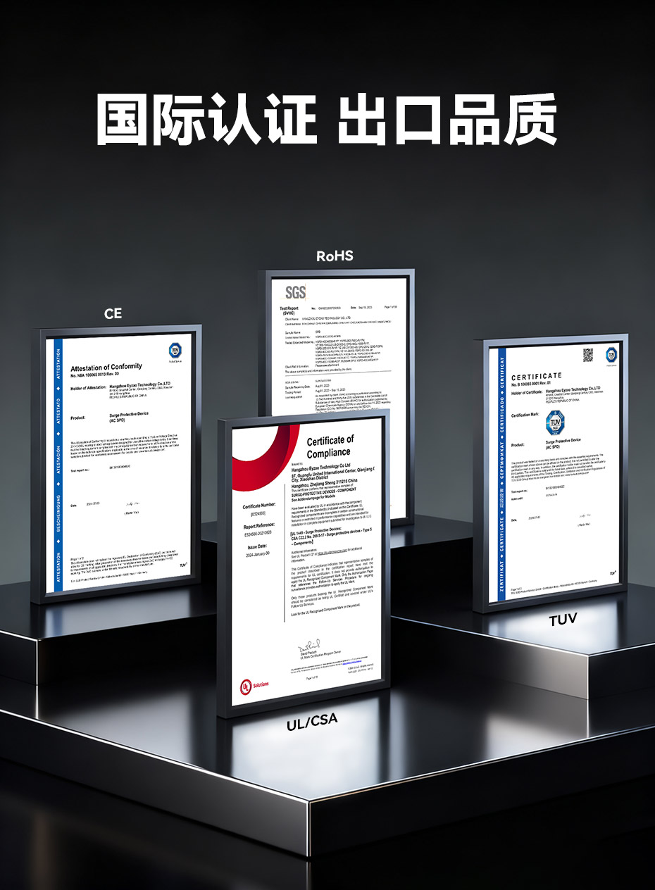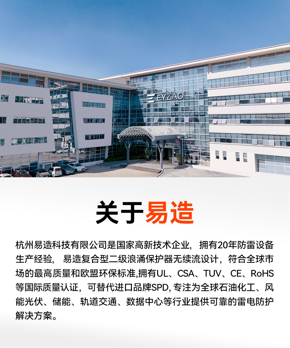 易造T2級大通流浪涌保護器,擁有UL、TUV.CE、COC等國內國際質量認證,符合全球市場的最高安全和RoHS歐盟環保標準,可替代進口品牌SPD,支持出口。
