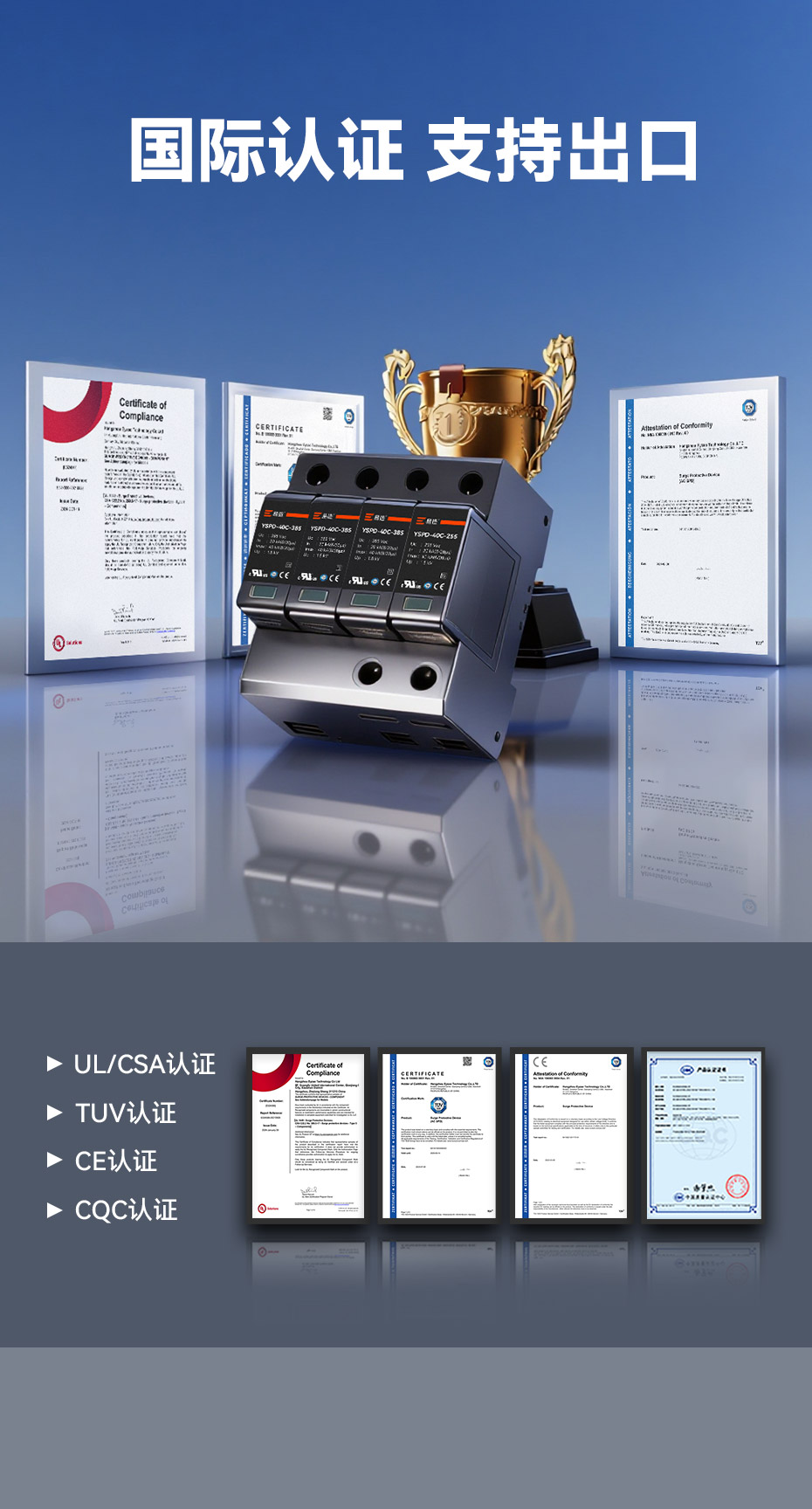 易造認(rèn)證浪涌保護器規(guī)格型號齊全,滿足全球各個國電力系統(tǒng)單相和三相的防雷保護,符合全球市場的最高質(zhì)量和歐盟環(huán)保標(biāo)準(zhǔn),可替代進口品牌SPD,支持外貿(mào)出口定制。