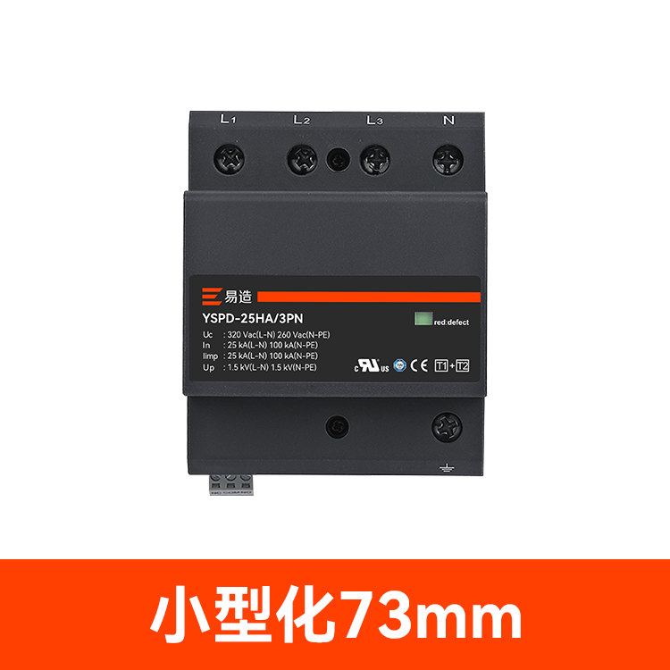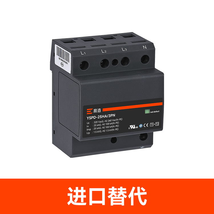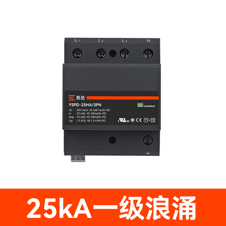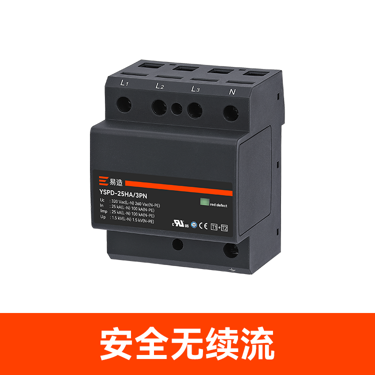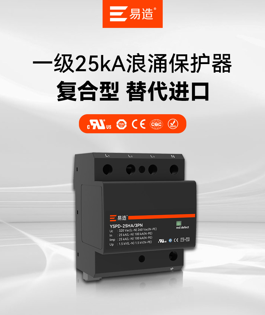 易造1+2級25kA復合型浪涌保護器安全無續流、小體積、高通流、低Up,帶故障指示、遠程告警功能,維護方便,最大持續工作電壓Uc高達760Vac,可直接保護終端設備。